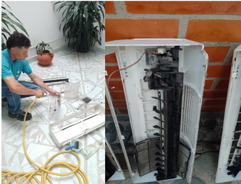 Usamos agua a presión para limpiar a fondo las partes internas del aire acondicionado, asegurando que funcionen de manera eficiente.